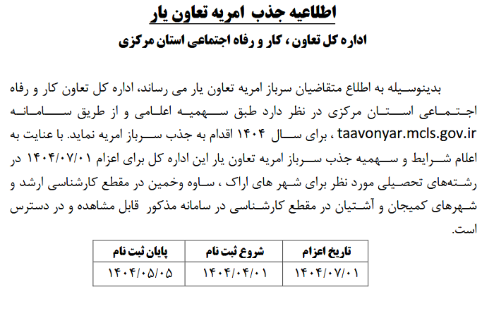 اطلاعیه جذب امریه تعاون یار ۱۱ تیر ۱۴۰۴ | ۱۲:۰۴ کد : ۵۲۷۴۸ اطلاعیه ارسال به دیگران نام شما ایمیل شما ایمیل دریافتکننده ارسال انصراف تعداد بازدید:۱۰۲۴ اطلاعیه جذب امریه تعاون یار
